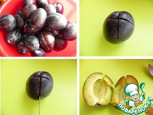 У сливы сделать надрез крестом. И от одного надреза прорезать сливу вдоль. Удалить косточку.