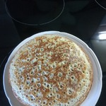 Это мой первый блин. Вот так тесто стало пузыриться на сковороде (ее я смазала растительным маслом). Мне показалось, что блин толстоват и я добавила в тесто еще немного кипятка.