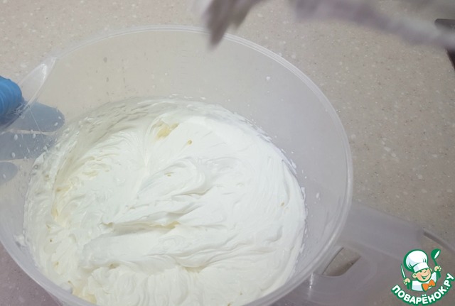 Холодные сливки с сахарной пудрой взбиваем до плотных пик. Чаша должна быть чистой и сухой. Перекладываем крем в кондитерский мешок, но можно и без него.