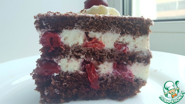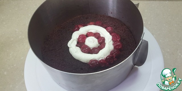 Собираем торт в кольце. Корж-пропитка-крем-в ишня и т д. Пропитки у меня ушла половина, но если любите очень влажные торты, то пропитайте больше) Можно выкладывать как на фото или сначала пропитать, потом выложить слой крема и сверху вишню. Даем постоять в холодильнике несколько часов, чтобы крем схватился.