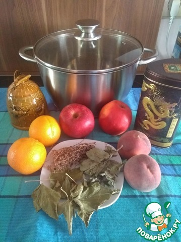 Ингредиенты, которые потребуются для чая. Персики у меня не очень спелые, но для чая нормально. Кастрюля пятилитровая, воды в ней будет почти 4 литра.
