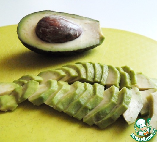 Авокадо очистить, разрезать на четыре части вдоль, каждую часть на пластины.