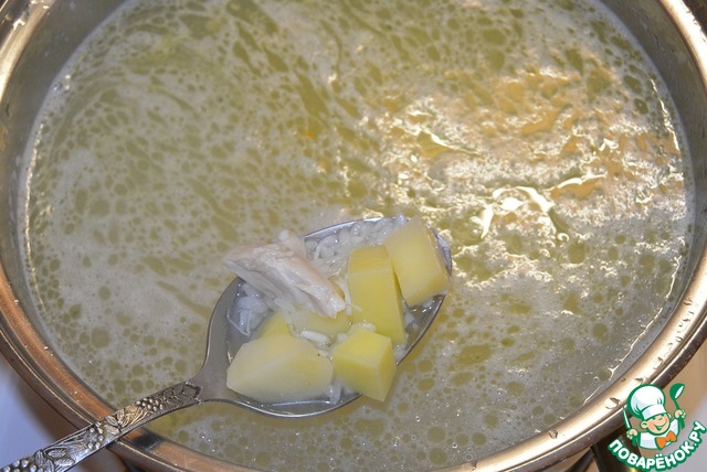 • Поставить бульон на плиту, довести до кипения, закинуть рис. Варить до полуготовности риса. Когда рис будет полуготов (слегка хрустеть еще), добавить картофель.
