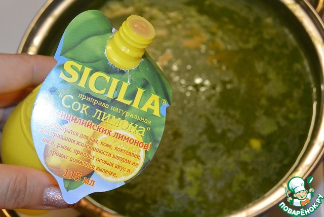 • Посолить по вкусу, поперчить, добавить кориандр, извельченный чеснок и лимонный сок по вкусу (я использовала 1 столовую ложку). Довести до кипения и выключить огонь.