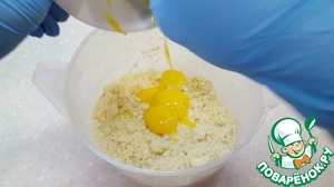 Муку с сахарной пудрой просеять, добавить холодное сливочное масло и перетереть пальцами в крошку. Затем добавить желтки.