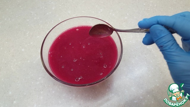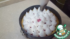 Меренга должна увеличится в объеме, стать плотной и глянцевой. Перекладываем в мешок с круглой насадкой (или накладываем на пирог ложкой)