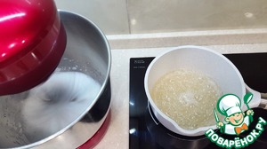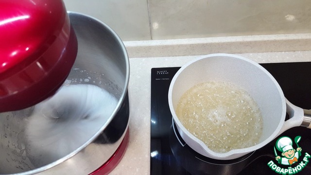 Делаем итальянскую меренгу (или заварной белковый крем). В сотейнике смешиваем сахар и воду. Ставим на огонь и доводим до 118 градусов. Параллельно с этим взбиваем белки. Сначала на низкой скорости, затем переходим на высокую, когда сироп активно закипит. Если нет термометра, то наливаем небольшое количество сиропа в холодную воду и пробуем скатать мягкий шарик. Если получилось, то выключаем огонь. Тонкой струйкой вливаем сироп в белки. Скорость при этом убавляем до средней. Льем сироп по стенке, не попадая на венчик.