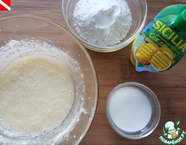 Отдельно смешать муку и разрыхлитель. В яично-масляную смесь влить молоко, размешать, затем лимонный сок ТМ Sicilia. Аккуратно вмешать муку и цедру лимона.