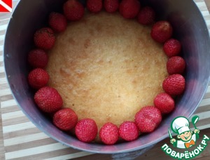 Кольцо диаметром 18 см затянуть пищевой пленкой, бока проложить ацетатной лентой, уложить бисквит. Свежую целую клубнику вымыть, обсушить бумажным полотенцем. Уложить на бисквит. В зависимости от размера ягод вам может понадобиться больше или меньше.