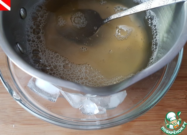 Теперь будущее лимонное желе необходимо охладить до 9 градусов. Быстрее всего это сделать на ледяной бане, постоянно помешивая для равномерного охлаждения.