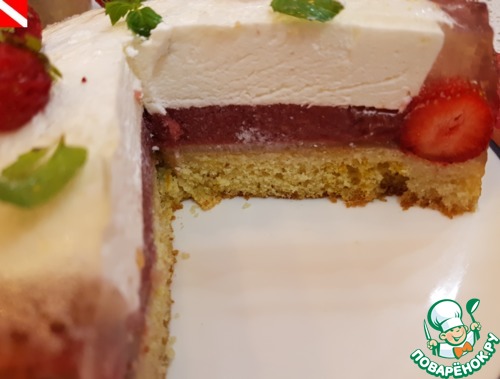 Мусс. Охлажденные сливки взбить с сахаром до растворения сахара.. Желатин разогреть в микроволновой печи или на водяной бане. Отложить пару столовых ложек взбитых сливок в желатин, размешать и ввести обратно в основную массу сливок. Продолжить взбивание до мягких пиков. Выложить на клубничное желе. Заморозить.