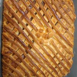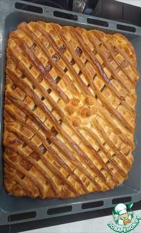 Украсить пирог по вкусу. В качестве украшения может служить решетка, выполненная при помощи ролика-резца для теста. Поверхность пирога (решетки) смазать взбитым яйцом, посыпать сахаром. Пирог поместить в разогретый до 180-190*С духовой шкаф. Выпекать до готовности (румяной корочки)