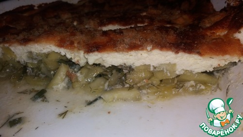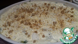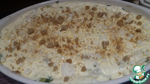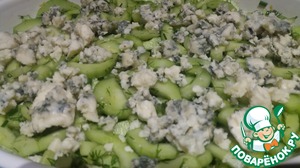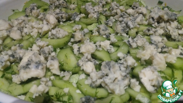 Форму для запекания смазать маслом, выложить дно формы огуречной смесью. Сверху раскрошить сыр "Рокфор"