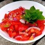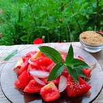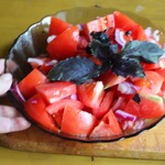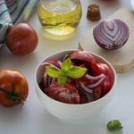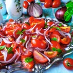 Классическое сочетание спелых, созревших на летнем солнце помидоров и сладкого, сочного ялтинского лука знакомо многим. Добавление листьев базилика и мяты делает, казалось бы, простой и быстрый в приготовлении салат пикантно-нежным, интересным и неожиданно вкусным. Рецептура салата была разработана еще в советское время для предприятий общественного питания. Здесь важно соблюдать все пропорции. Количество ингредиентов выверено безупречно.