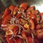 Насколько мне не изменяет память, этот салат делают без масла. Это в том случае, когда помидоры очень сочные. Просто помидоры, лук и соль.