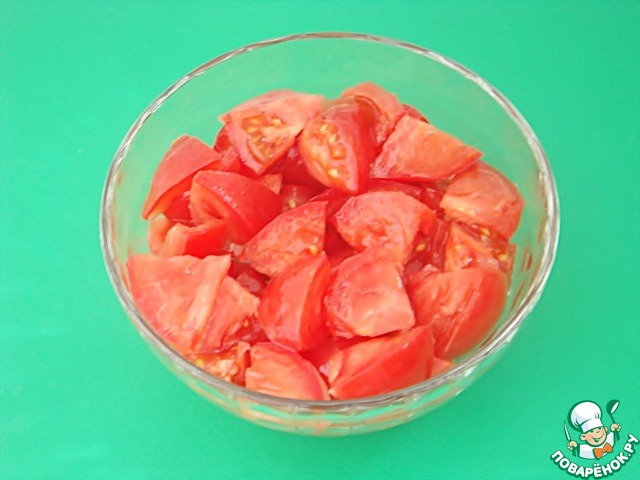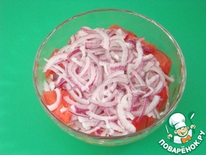 Ялтинский лук разрезать пополам, еще раз пополам, а затем -четвертькольцами. Выложить сверху помидоров.