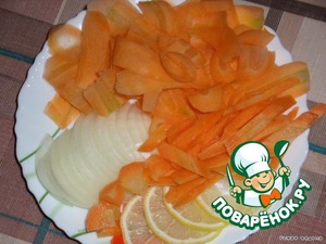 Нарезаем лук полукольцами, лимон колечками, морковь тонкими пластинками (с помощью ножа для чистки овощей), часть моркови соломкой.