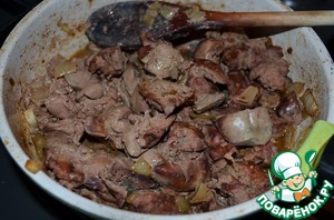 Добавить кусочки печени, обжарить 5-8 минут, затем
