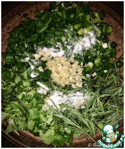 В зелень добавить мелко нарубленный чеснок (я взял три крупных зубчика) и соль. Ложки полторы чайной. И хорошо перемешать.