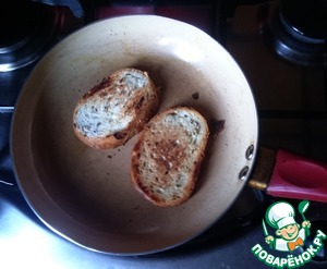 Кастрюлю с водой и сковороду ставим на огонь. Пока вода закипает в сковороду добавляем немного оливкового масла и обжариваем пару ломтиков белого хлеба.