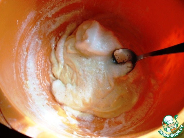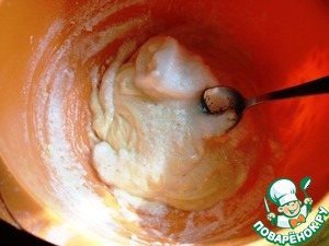 Яйца разделить на белки и желтки. Белки взбить с 1 ст л сахара до пиков.