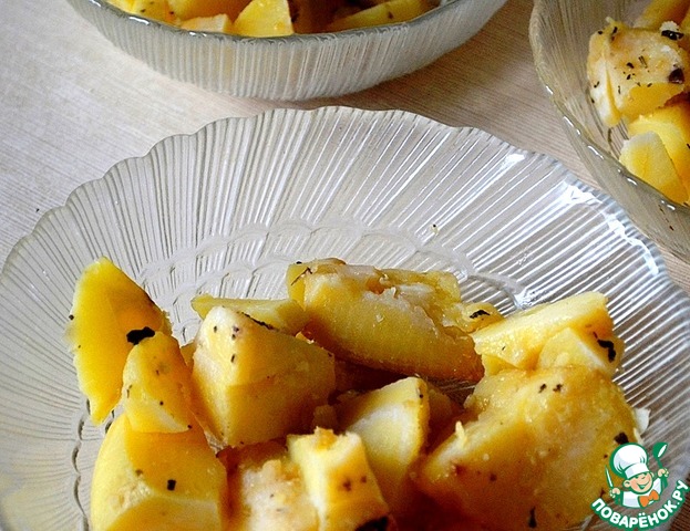 • Запеченный картофель нарезаем ломтиками - кладем в салатники, присыпаем любимыми приправами, у меня прованская смесь