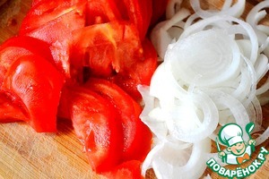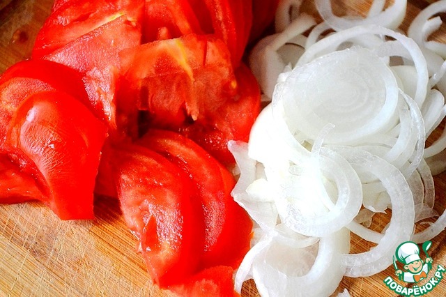 • Тонко нарезаем помидоры и лук