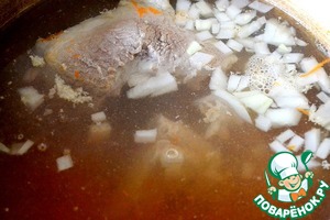 Первым делом ставим готовиться бульон - кастрюля на 3 литра, кладем свинину, тертую морковь и нарезанный репчатый лук. -