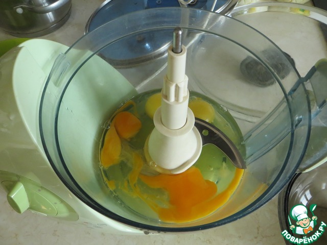 В кухонный комбайн разбить яйца. У меня в комбайне стоит нож для измельчения. Можно, конечно венчиком, но это долго и трудоемко.