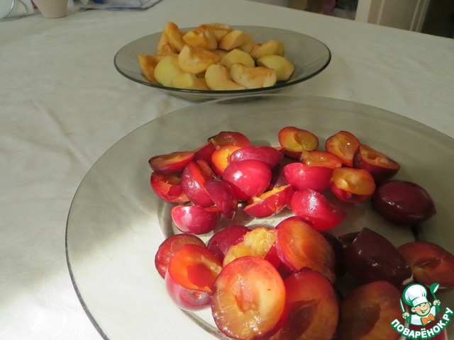 Помыть яблоки и сливы. Очистить яблоки от серединок и шкурки, сливы от косточек.