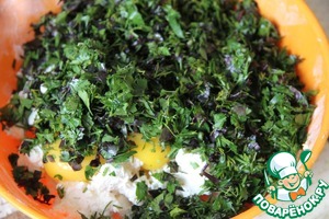 В это время приготовить начинку: отделить желтки от белков, добавить в желтки творог и перемешать. Затем добавить мелко нарезанную зелень и лимонный сок.