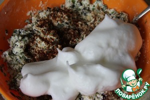 Белки взбить в пышную пену и добавить к творогу. Перемешать. Посолить, поперчить, добавить паприку.