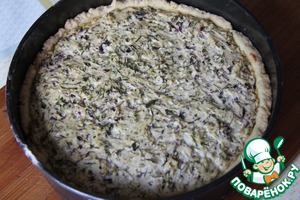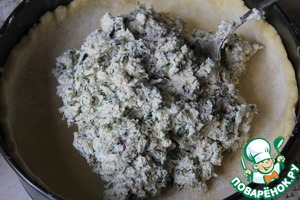 Форму для выпечки смазать маслом, выложить в нее тесто, сделав высокие бортики. На тесто выложить начинку.