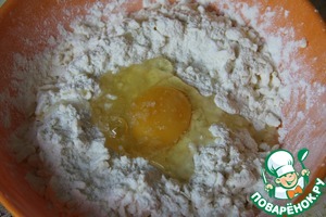 Муку высыпать в глубокую миску, добавить холодное масло и порубить его (можно натереть на терке). Перемешать руками, добавить яйцо и соль. Замесить крутое тесто. Если нужно — добавить муки, а если тесто туго замешивается, добавить 1 столовую ложку холодной воды.