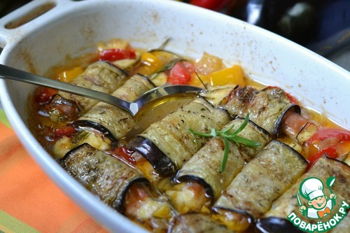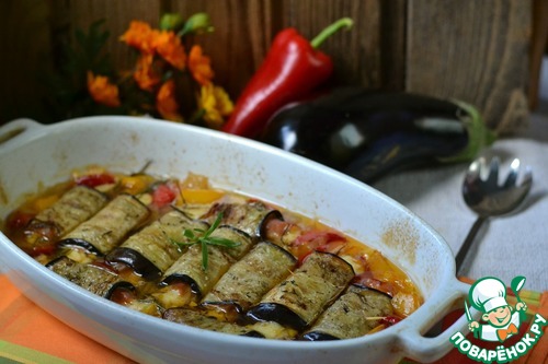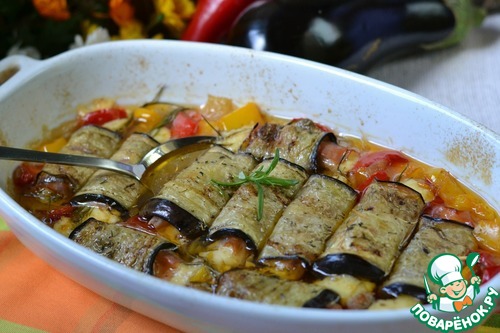 Перечную подливу вылить в подготовленную форму для запекания. Готовые рулетики баклажана выкладываем в подливу. Запекаем в разогретой духовке при 180гр 20-25 минут.