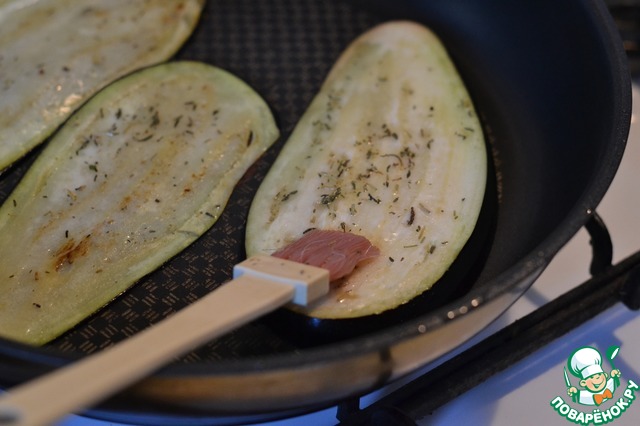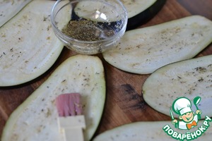 • Пластинку баклажана смазать подготовленной смесью, при помощи кисточки, только с одной стороны.