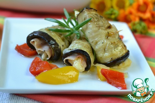 На остывшую пластинку баклажана выкладываем кусочек ветчины
