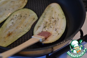 Смазать верхную сторону пластинки баклажана смесью и только тогда перевернуть баклажан. Быстро обжарить. -