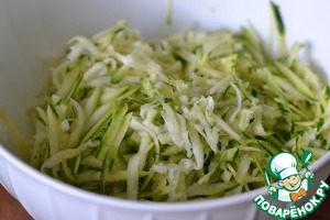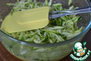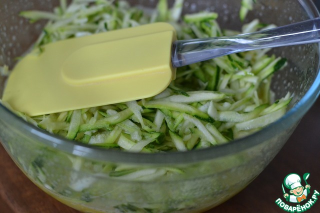 Добавить цуккини к яйцам. Добавить подсолнечное масло. Перемешать лопаткой.