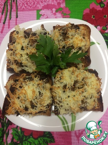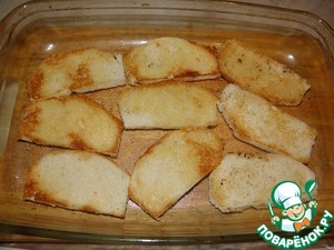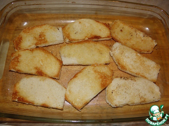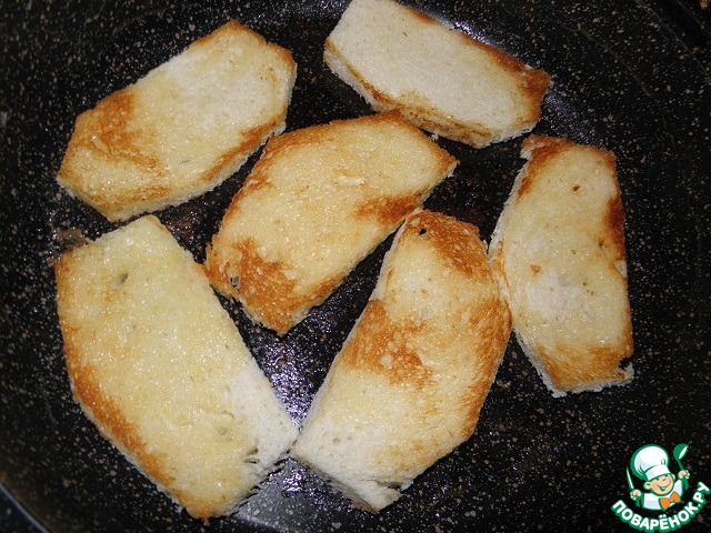 С ломтей хлеба срезаем корочку, и обжариваем их в небольшом кол-ве сливочного масла (делаем гренки).