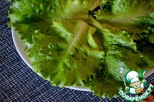 Листья салата промываем, обсушиваем, кладем на блюдо. -