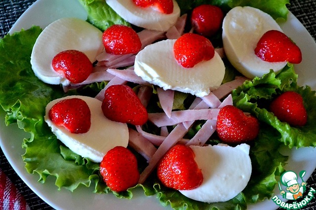 Поверх ветчины кладем ломтиками нарезанную моцареллу и половинки ягод клубники.
