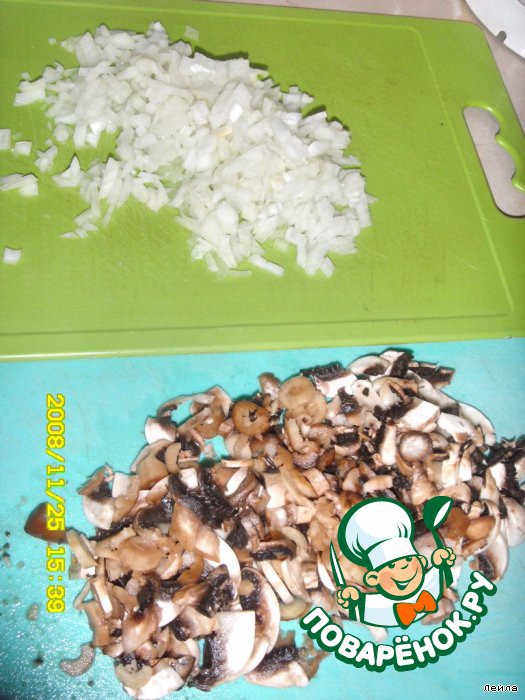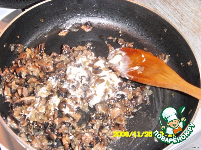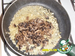 В начале я грибы потушила под крышкой без масла, отложила. В сковородку налить растительное масло, пожарить лук, затем положить грибы и потушить вместе под крышкой, посолить, поперчить.