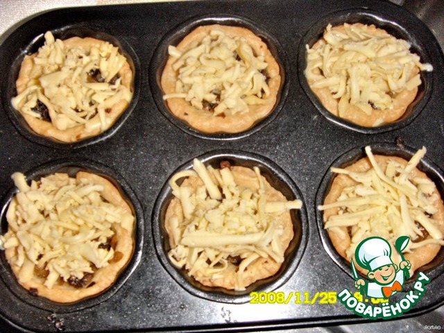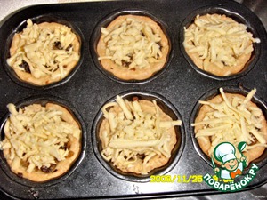 Выпекать на среднем жару около 20-25 минут. Достать из духовки, посыпать тертым сыром и запекать еще до полного расплавления сыра. Корзиночки остудить и достать из формочек.