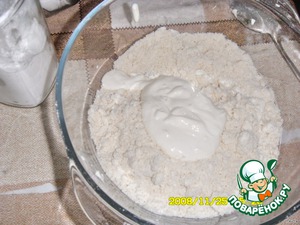 В сметану добавить соду и соль, перемешать. Выложить сметану к тесту.
