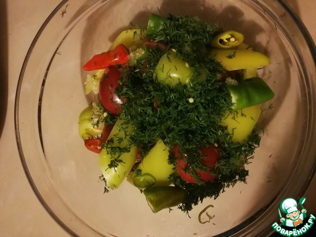 Добавляем оставшийся нарезанный острый перец и тот что не дорезали тоже кладём. |