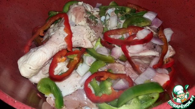 Лук порезать кубиками, чеснок мелко, перец болгарский полукольцами, майоран, черный перец-перемешать с курицей и залить вином. Оставить мариноваться 1 час.