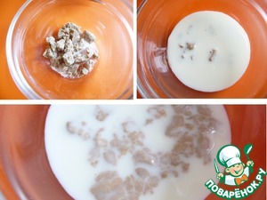 Дрожжи раскрошить и залить небольшимм количеством молока и сахара, взять от общего объема. Дать настояться 10 мин.