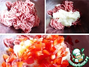 В миске смешать фарш, добавить мелко нарезанный лук (у нас лук очень жесткий, я взбила его в блендере), измельченный красный перец. -