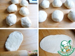 Каждую заготовку раскатать в тонкий овал. При раскатке тесто нужно оторвать от рабочей поверхности и перевернуть.